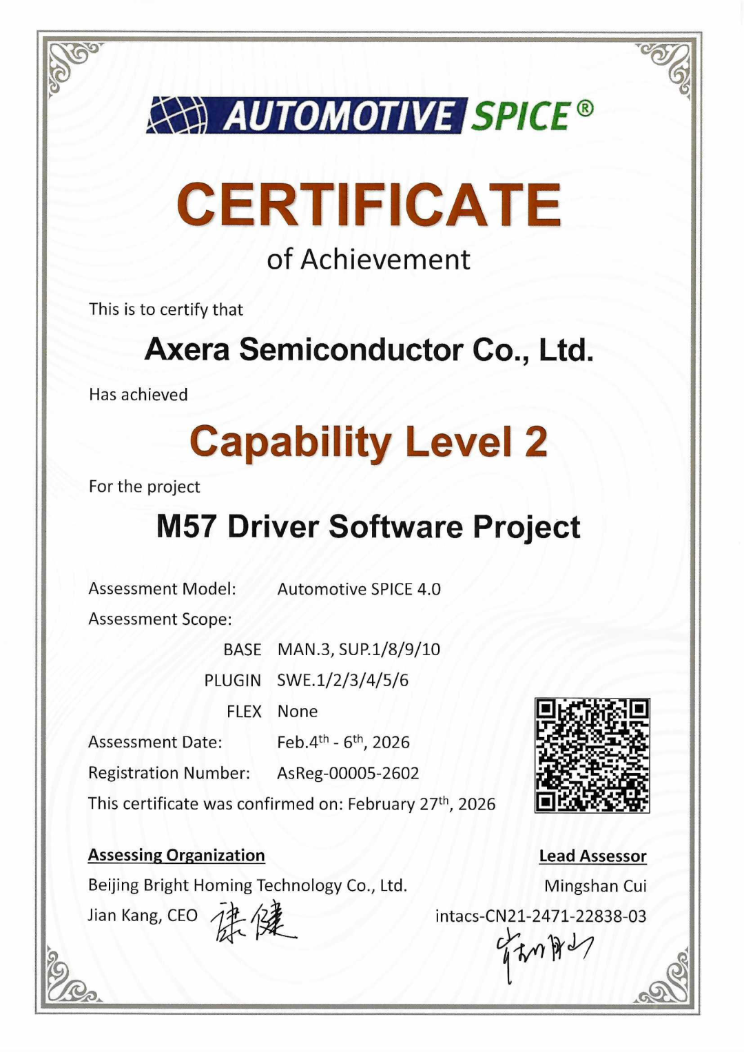 近日,爱芯元智(股票代码:0600.HK)正式宣布,旗下M57芯片驱动软件项目成功通过Automotive SPICE®(汽车软件过程改进及能力评定)能力等级L2国际评估,并已在德国汽车工业协会质量管理中心(VDA QMC)完成官方注册,获颁带唯一注册编号与官方标识的合规证明。这一里程碑成果,标志着公司车规级芯片软件研发全流程成熟度、过程质量与交付管控能力全面达到国际汽车行业权威标准。
